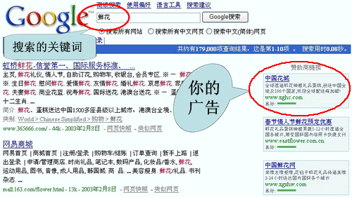 以纯文本方式将广告安置在相关搜索页面的右侧空白处,每个页面最多放置8个这样的文字链接。